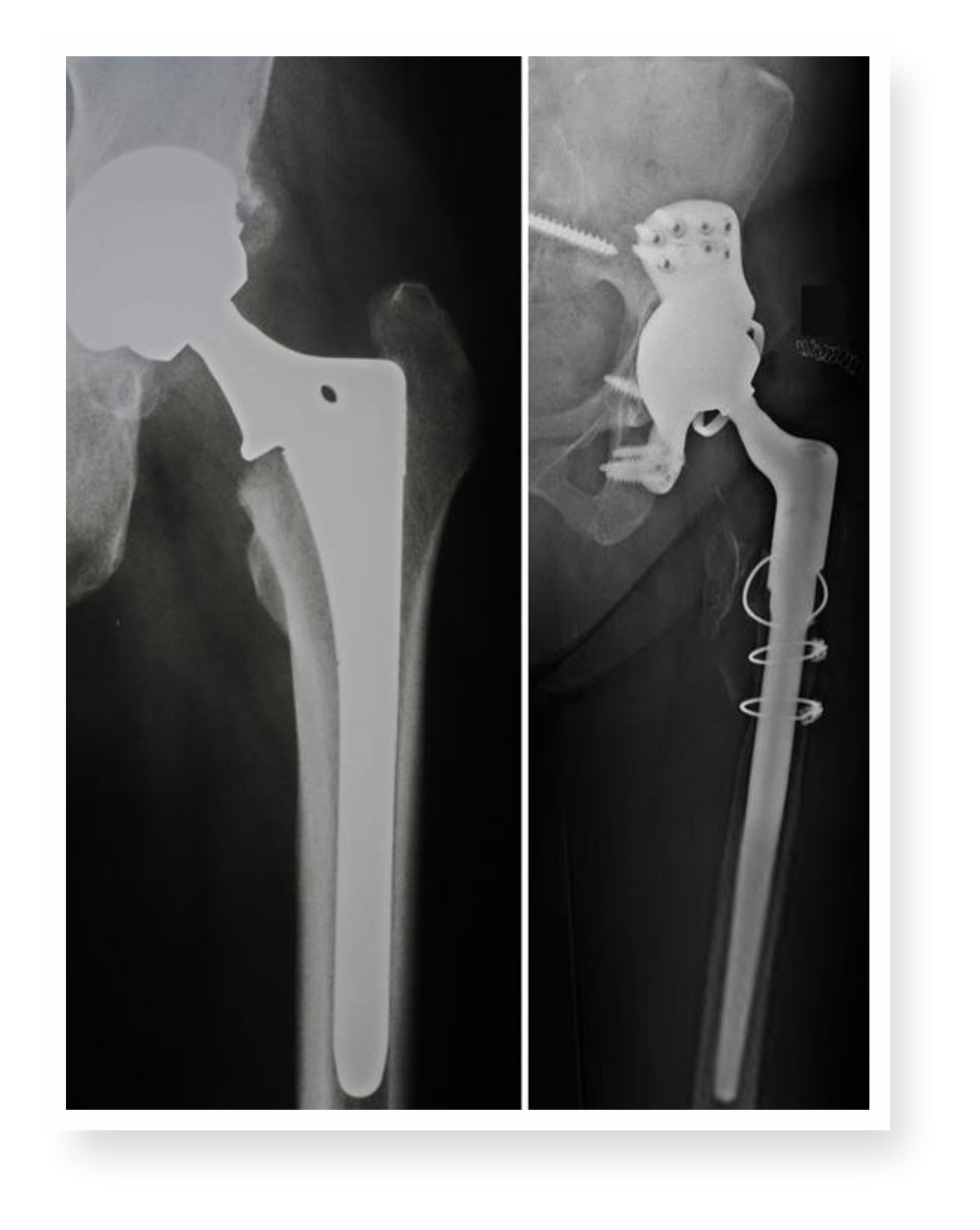 Damage to bone and soft tissue around the hip may make it difficult for the doctor to use standard primary hip implants for revision hip replacement. In most revisions, the doctor will use specialized implants that are designed to compensate for the damaged bone and soft tissue.